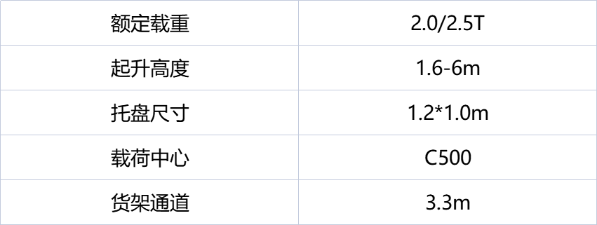 2.0吨至2.5吨额定载重,起升高度可至6米