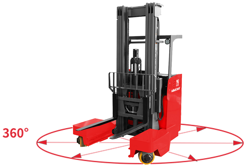 MQ系列叉车是一款适合窄巷道堆垛作业、长物料搬运的窄体站驾式全向叉车,起升高度3.0m~8.0m。较普通前移式叉车,它具备直行、侧行、斜行、直角转弯、原地回转等行驶模式。特别是侧向行驶功能使得车辆更适合叉取长条状的货物,如金属型材、钢筋、板材等。